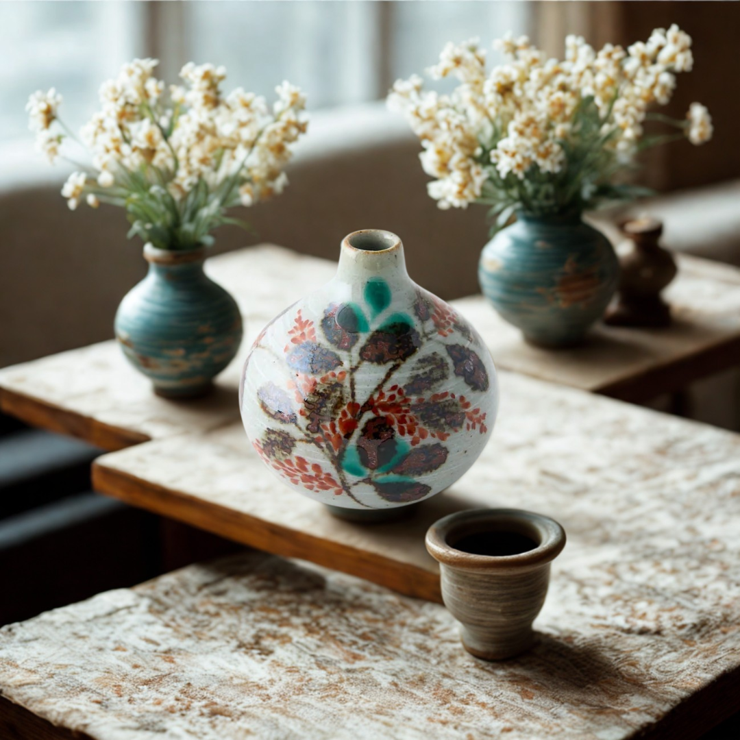 This mini flower vase is made with a base of Karatsu clay and a carefully selected coating of Amakusa clay, finished with hand-painted underglaze and overglaze decoration.